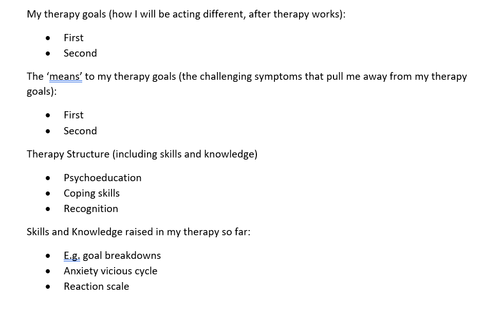 This takes me to the second change I introduced – I decided to see if I could take the discussion on a client’s goals and write them into a word document during the session. This was with idea that client’s could have in one place their therapy goals, means goals, a reminder of the three pillars of therapy and a place to track what skills and knowledge had been covered in therapy so far. As seen below: