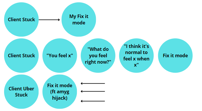 I still allow myself to be more directive with client’s who are very distressed, but calling out my “fix it mode” has helped erode at the belief that I need to solve that client’s distress right then and now.