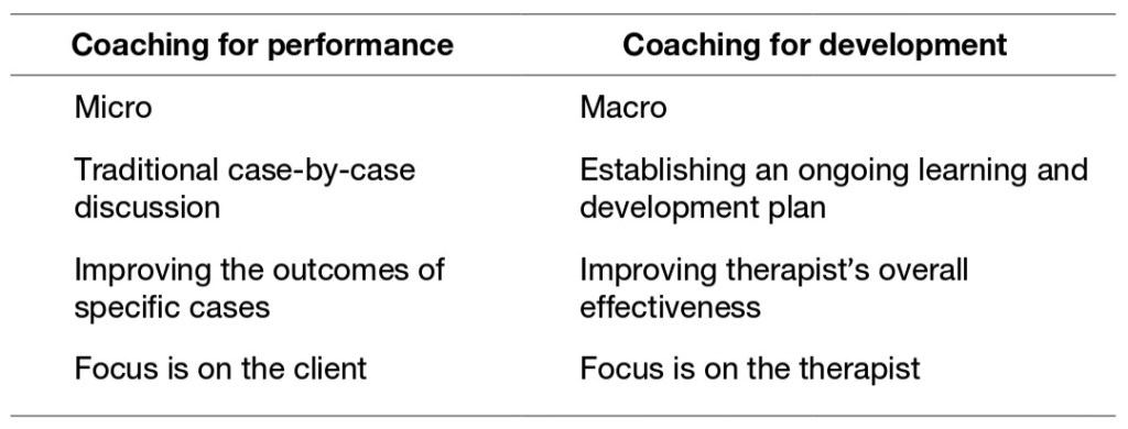 You might be thinking, “Well, what about supervision? Surely that helps me improve my outcomes?” Once again, the research is suggesting that this is also incorrect, as unfortunate as it is. Daryl Chow has put forward the argument that how we currently undertake supervision is coaching us to “perform,” whereas to improve our effectiveness we need to engage in coaching to “develop.” The table below is a handy rundown on the difference between these two coaching styles.